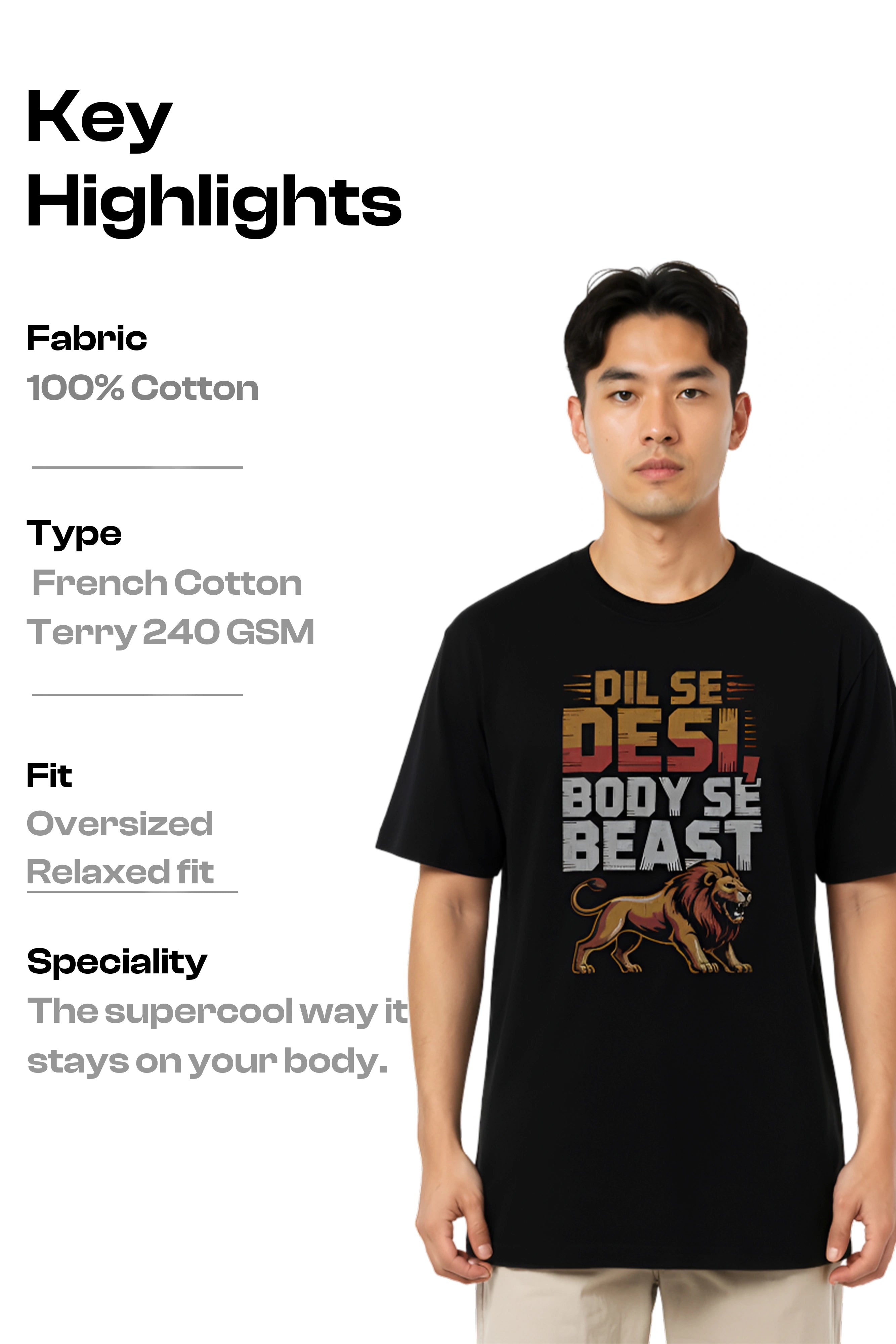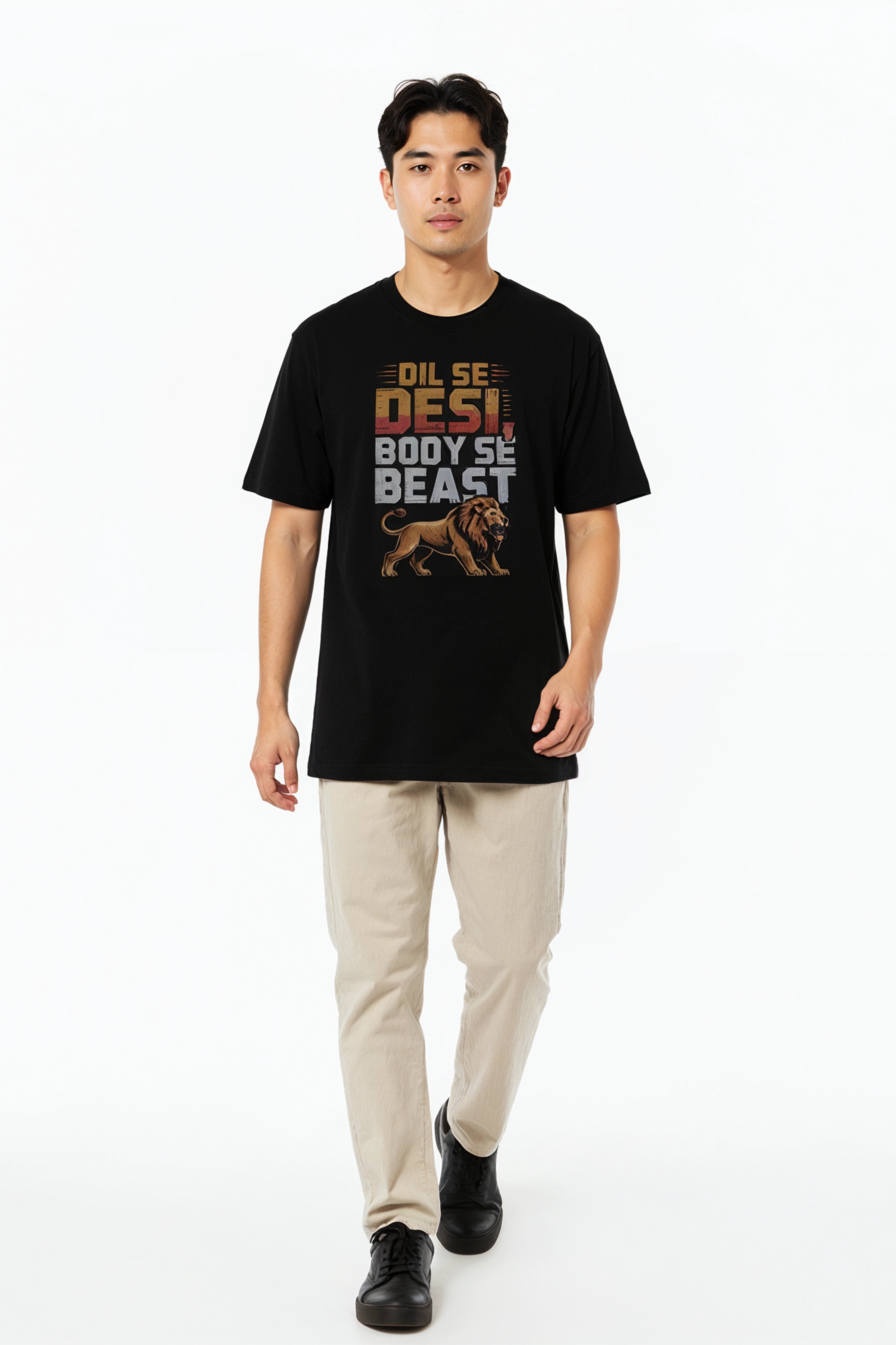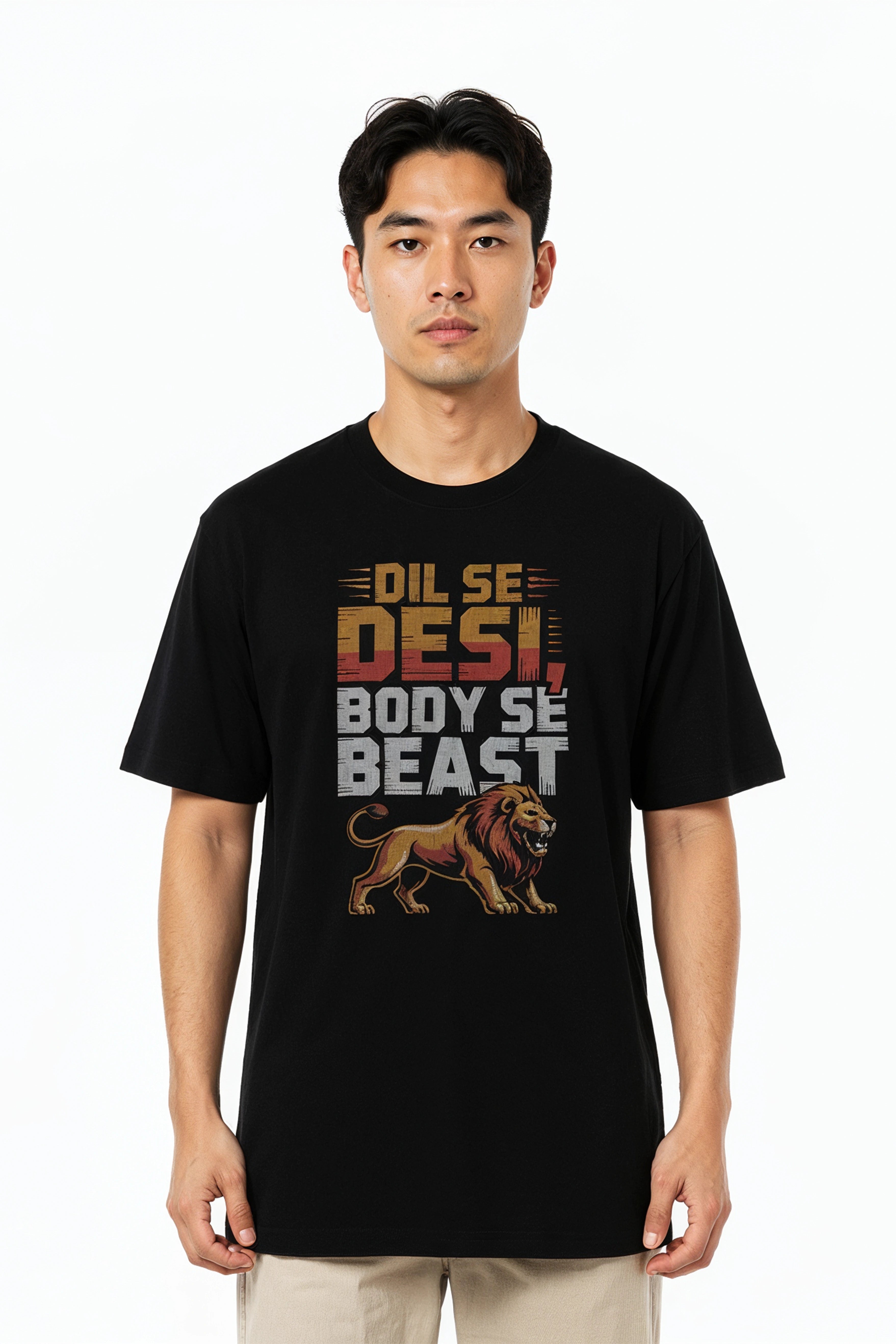 Modern Fit: Features a contemporary oversized fit with dropped shoulders, providing a relaxed, on-trend silhouette that ensures maximum comfort and freedom of movement. Bold Design: Features the Typography Design dil se desi body se beast.as a premium, high-quality detail on the chest. A subtle yet instantly recognizable statement for those in the know. |