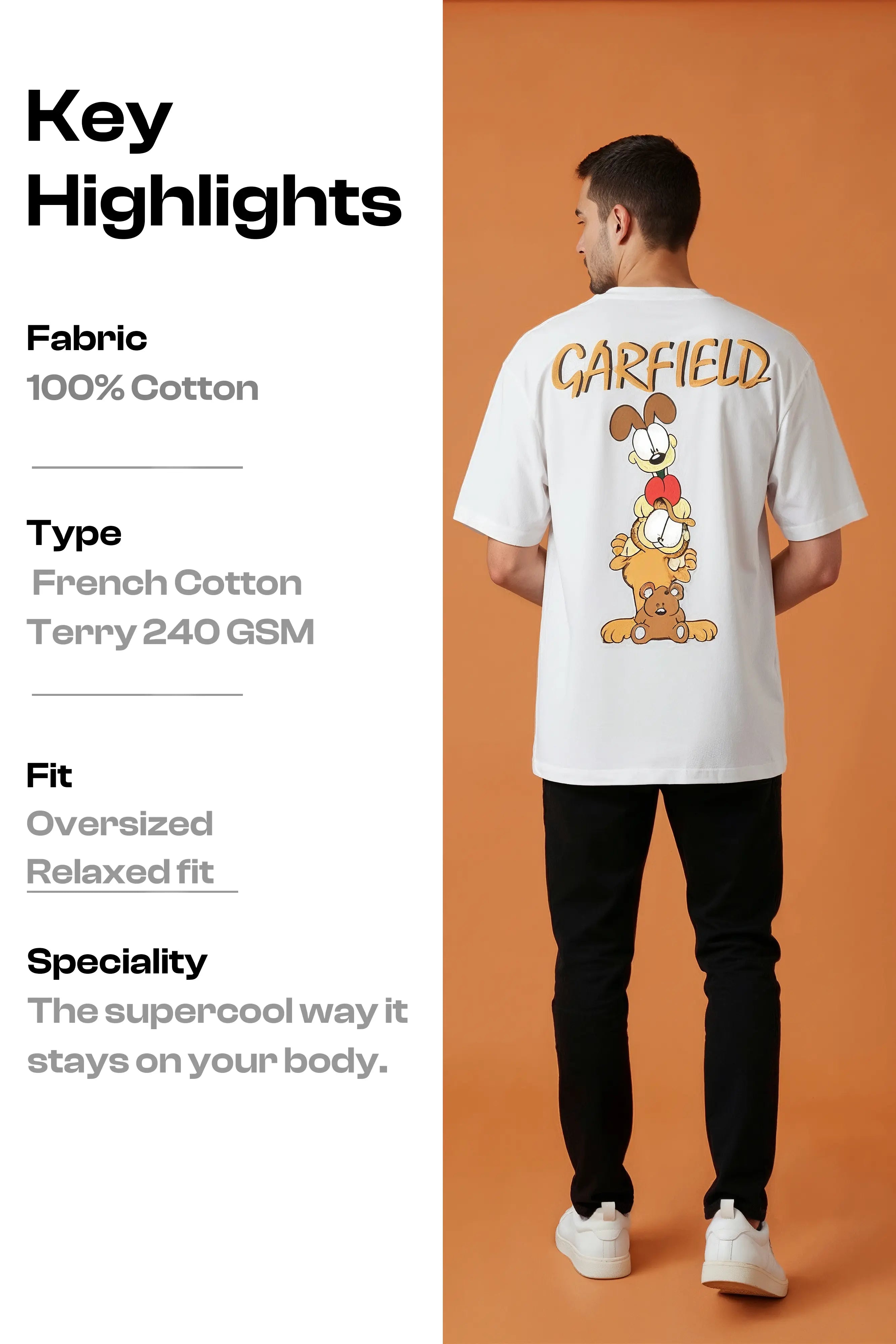 Product details :- Premium Fabric: Crafted from high-density 240 GSM French Terry Cotton, offering a substantial, high-quality feel that drapes perfectly. It's breathable, durable, and ideal for year-round comfort. Modern Fit: Features a contemporary oversized fit with dropped shoulders, providing a relaxed, on-trend silhouette that ensures maximum comfort and freedom of movement. Bold Design:Features a Garfield-style cat illustration with high-quality detailing on the chest. A subtle yet instantly recognizable statement piece for true fans.. Dispatch Location: We ship your order directly from our hub in Chandigarh, India. |